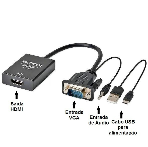 Este cabo adaptador de áudio e video Exbom CC-VHA30 possibilita estabelecer conexão entre aparelhos com saídas VGA e outros com entradas HDMI, por exemplo, adaptar as saidas VGA e de áudio analógico de um computador para conectá-lo a uma tela de alta definição.